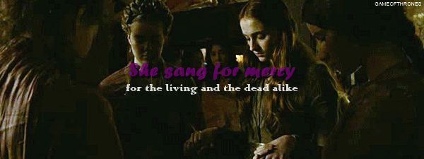 → →Elle chantait pour obtenir miséricorde en faveur des vivants comme des défunts, de Bran, de Rickon et de Robb, de sa sœur Arya comme de son frère bâtard Jon Snow, là-bas, sur le Mur. Elle chantait pour Mère et pour Père, pour son grand-père, lord Hoster, et pour Oncle Edmure, pour son amie Jeyne Poole et pour ce vieil ivrogne de roi Robert, pour septa Mordane et ser Dontos et Jory Cassel et mestre Luwin, pour tous les braves chevaliers et soldats qui allaient mourir en ce jour, pour ceux, enfants, épouses, qui les pleureraient, se décida même à chanter, finalement, pour Tyrion le Lutin et pour le Limier. A Clash Of Kings, Sansa V
